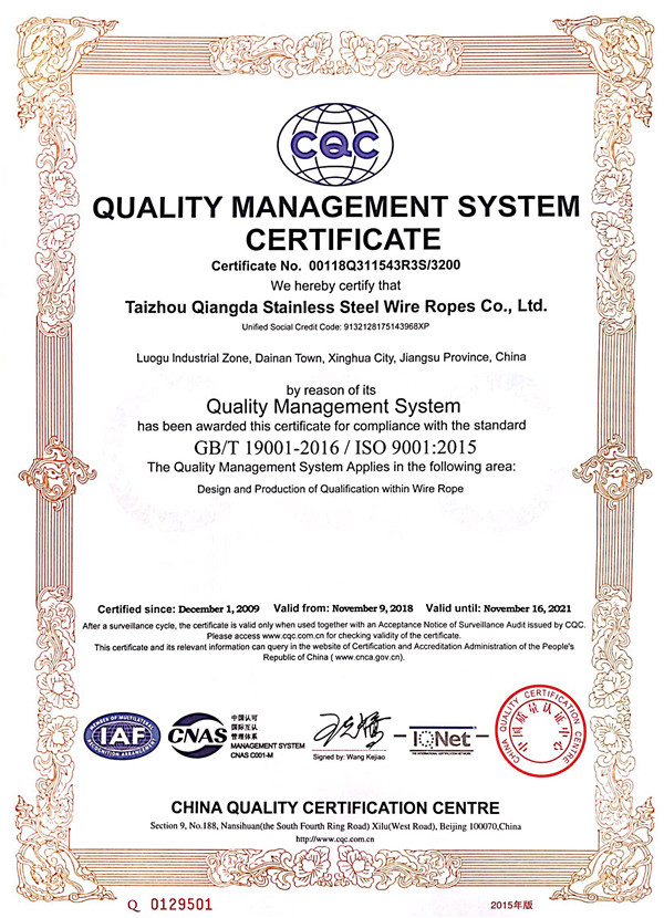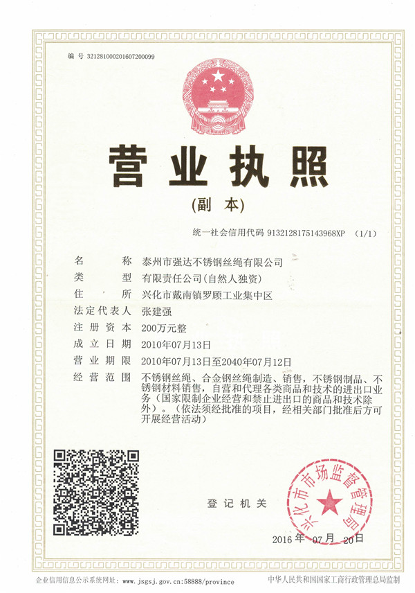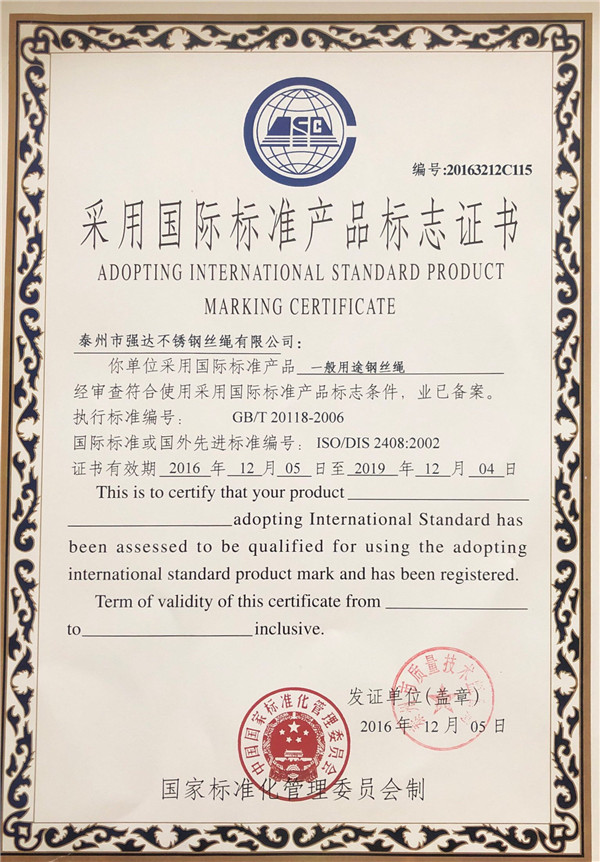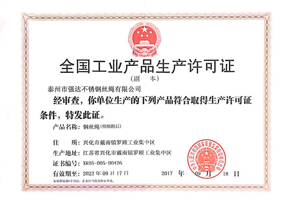 泰州市強達(dá)不銹鋼絲繩有限公司位于江蘇興化市戴南經(jīng)濟(jì)開發(fā)區(qū),公司致力于不銹鋼絲繩產(chǎn)品生產(chǎn),立志成為“國內(nèi)技術(shù)標(biāo)桿型吊索具生產(chǎn)企業(yè)”。以此戰(zhàn)略思想指導(dǎo),公司堅決貫徹“質(zhì)量贏市場,管理增效益,誠信贏天下”的質(zhì)量方針。以完善的服務(wù)在國內(nèi)不銹鋼絲繩市場樹立良好的品牌形象。公司榮獲“江蘇省質(zhì)量信得過企業(yè)。 靈活的管理機制,經(jīng)驗豐富的